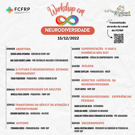 No dia 15/12/2022 realizaremos o Workshop em Neurodiversidade, organizado e promovido pela Comissão de Pesquisa da FCFRP-USP.